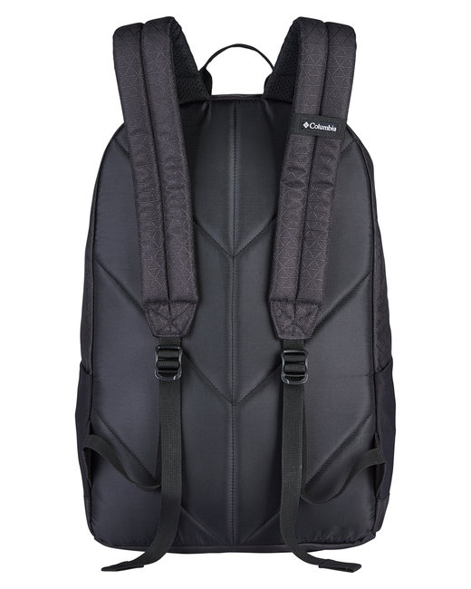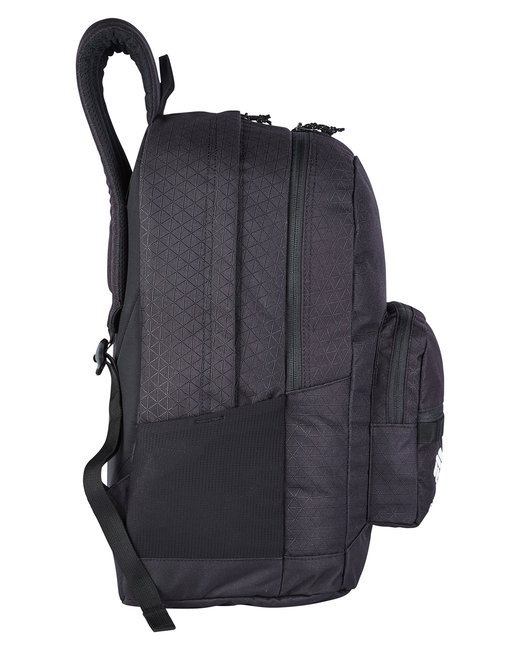 100% Polyester with PU coating; Black has a camo interior lining; Grey Heather and Cypress Camo have a grey interior lining; Collegiate Navy has a bright blue interior lining; Padded and fleece-lined laptop sleeve; Internal zippered pocket; two water bottle pockets; Two front accessory pockets; Two main compartments keep books and folders organized; Reflective zipper pulls; Flat padded bottom panel; 30 liter; fits up to 15" laptops; 18.125"H x 11.875"W x 8.25"D;