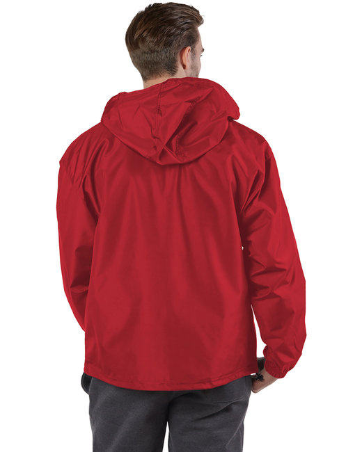 100% Polyester; Wind- and rain-resistant ; Adjustable bungee drawcord at hood and bottom hem; Attached scuba collar with hood; Oversized pouch pocket; Unisex micro poplin ; Packable; "C" patch on left sleeve near cuff; 'A' list status from CDP (Carbon Disclosure Project); Energy Star Partner of the Year (12 consecutive years); Every piece of Champion apparel purchased from our company qualifies for Hanes4Education;